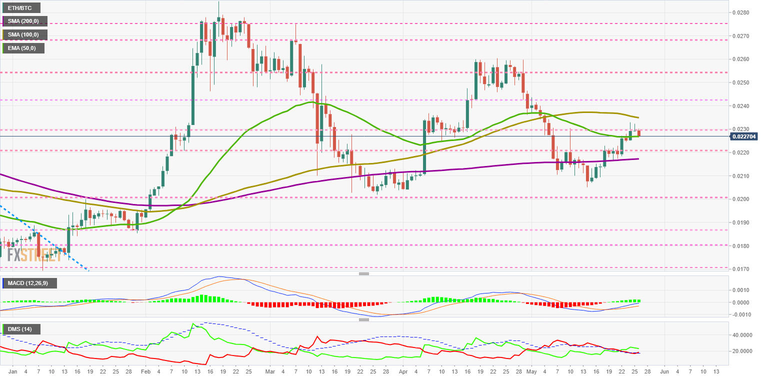 The DMI on the daily chart shows the bulls controlling the ETH/BTC pair, although the bears do see an opportunity in the current situation and move upwards above the ADX line.