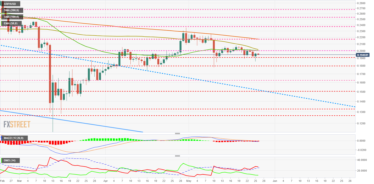 The XRP/USD pair is currently trading at $0.1945 and continues to move lower after the last attempt to break the resistance at $0.20. Price congestion resistance at $0.20 is reinforced by the presence of the 50-day exponential moving average and the 100-day simple moving average.