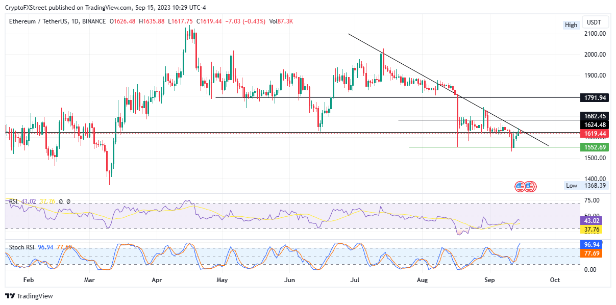 Ethereum (ETH) price found support at $1,552, bouncing 5% north to the current price of $1,619, and confronting resistance presented by the downtrend line at $1,624. Momentum is also waning for ETH, visible through the falling RSI. Aslump seems likely, and the Proof-of-Stake (PoS) token could drop 5% to $1,552 or 10% to the $1,500 psychological level.