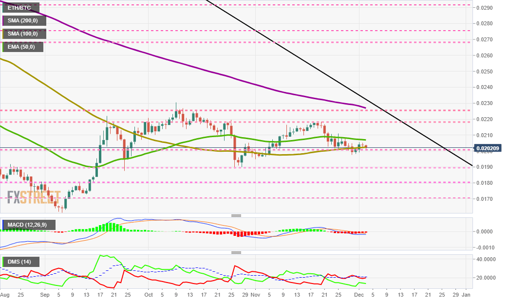 The ETH/BTC pair is currently trading at the price level of 0.0202 and continues through the narrow space provided by the EMA50 and the SMA100.
