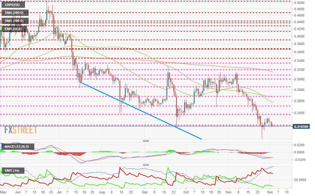 XRP/USD is currently trading at the $0.219 price level and loses the $0.22 support level. Below the current price, the XRP/USD pair is in danger of significant declines due to the lack of density of support levels.