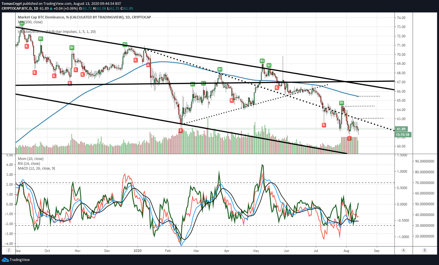 In the case of Bitcoin, the dominance level is now at 61.6%, and it's trying to form a technical floor. Below the 61.24% level, the positions could rotate actively towards Ether and the rest of Altcoins.