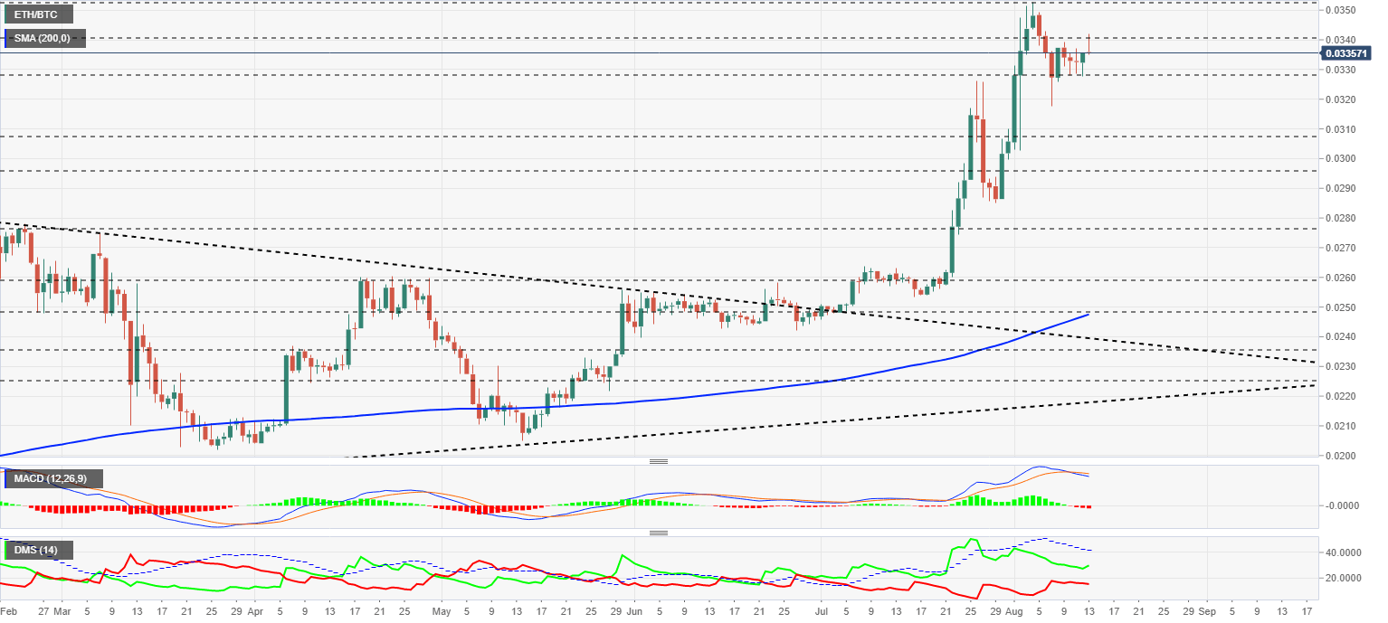 The ETH/BTC pair is currently trading at the price level of 0.0339 after a first afternoon attempt to break the resistance level at 0.034.