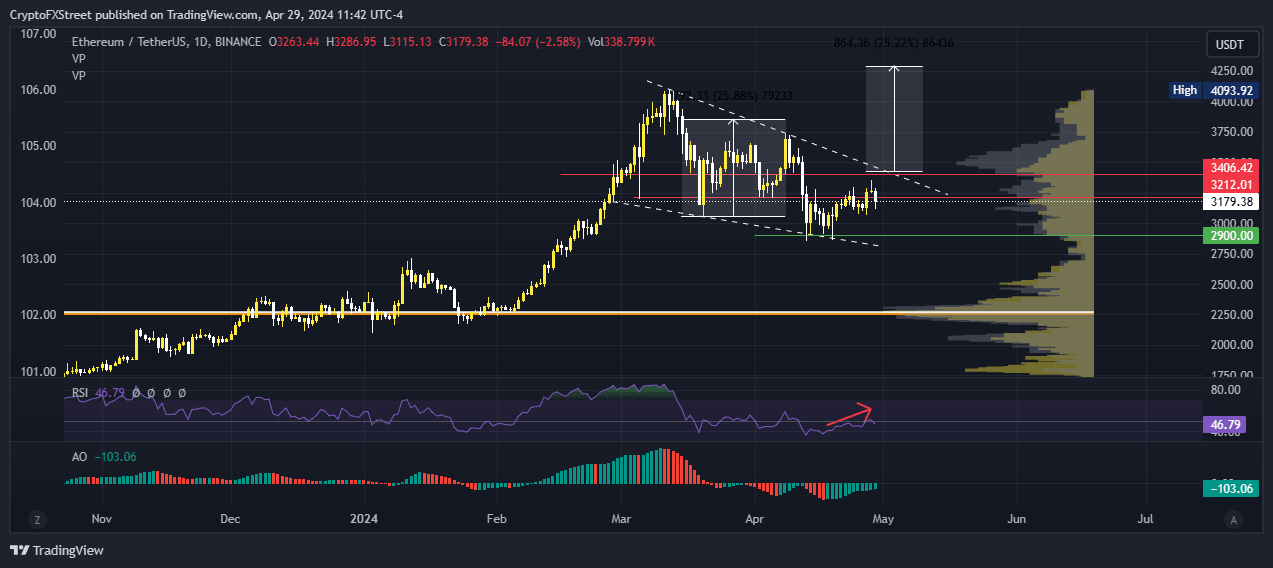 - Ethereum price could confirm a falling wedge pattern with a 25% run above $3,406 at breakout point.