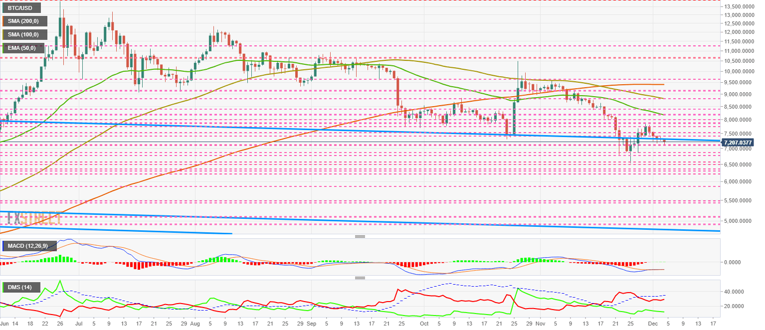 Above the current price, the first resistance level is at $7,300, then the second at $7,400 and the third one at $7,500.