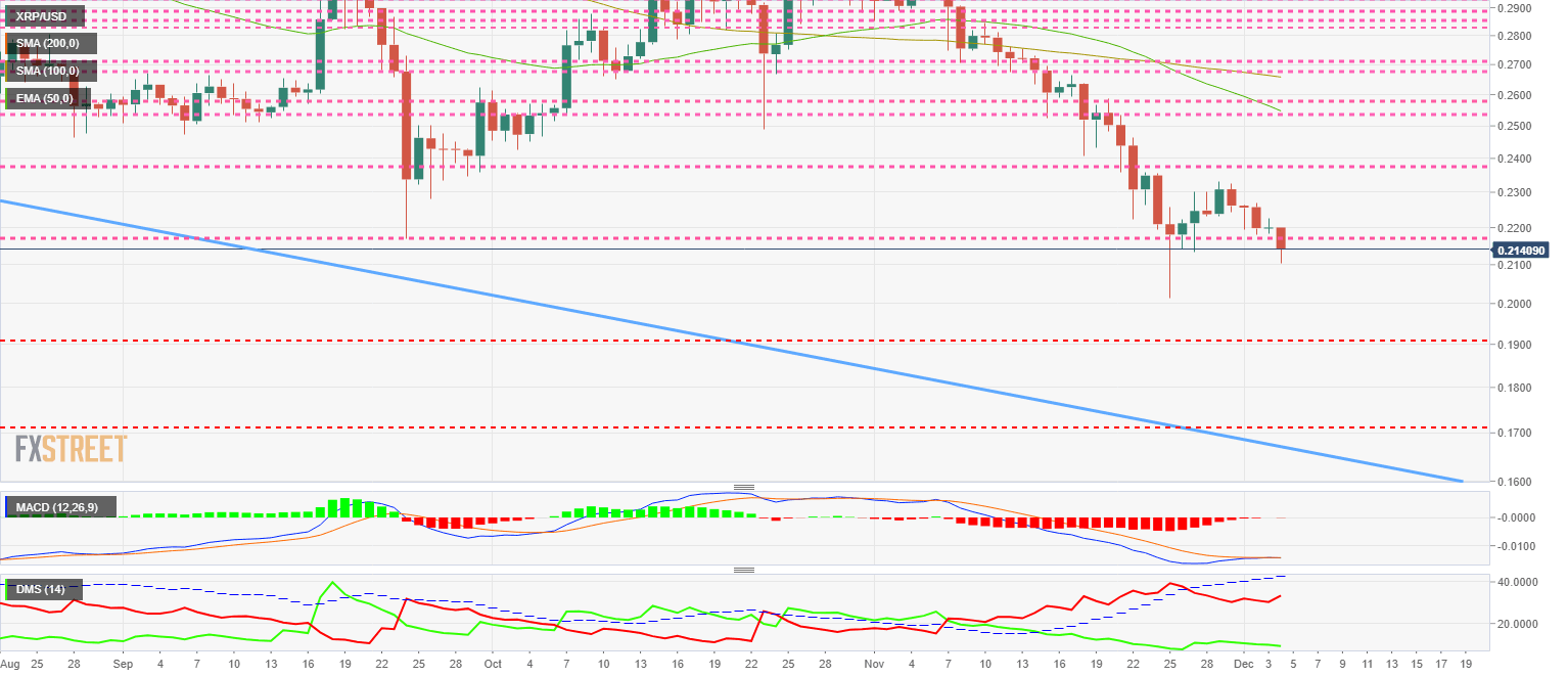 The XRP/USD pair is currently trading at the $0.214 price level and is losing support at $0.22 again. The current situation is risky, as below this level, and up to $0.19, there is no reliable support.