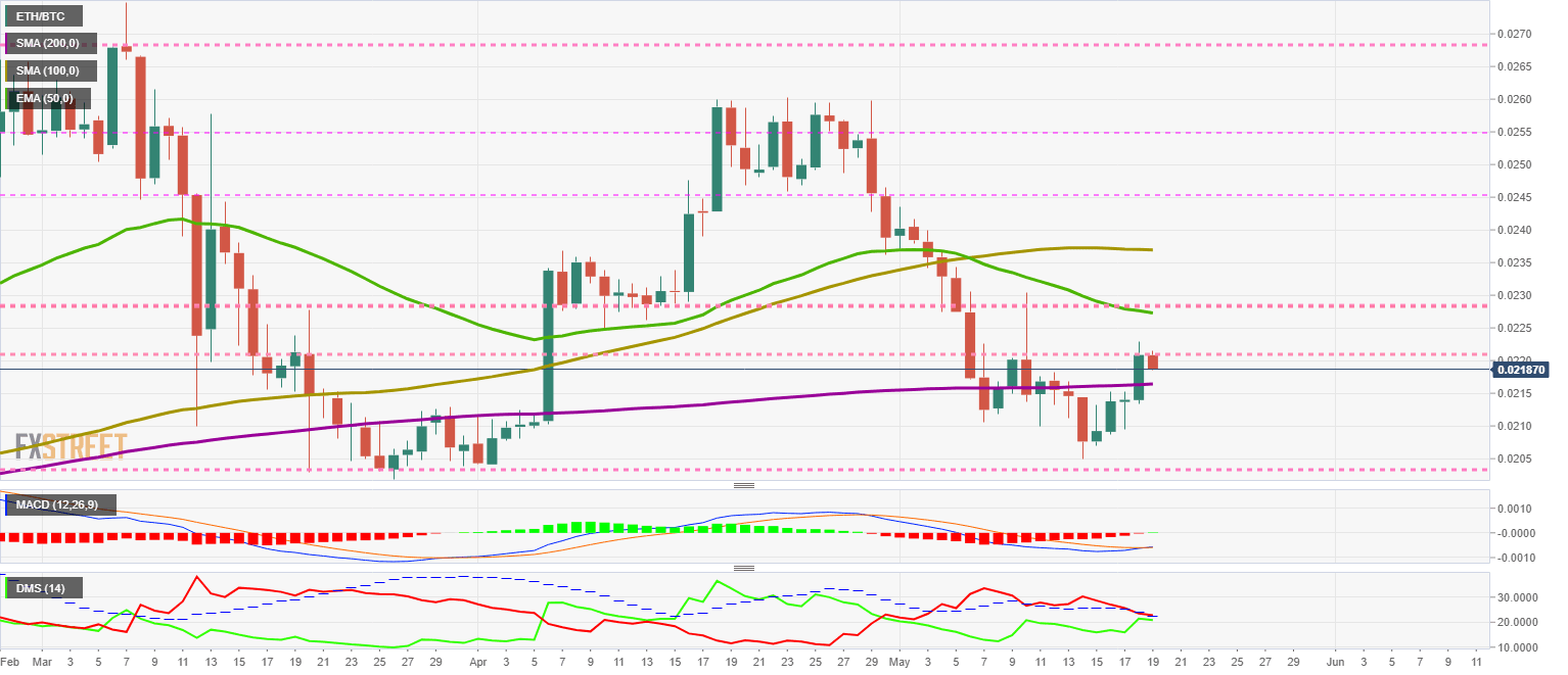 The ETH/BTC pair is currently trading at the 0.0218 price level, and today's target is to consolidate this level as a support for the next resistance levels. The main moving averages extend to the 0.024 level, while the standard to beat – the recent relative high – is at 0.0278.