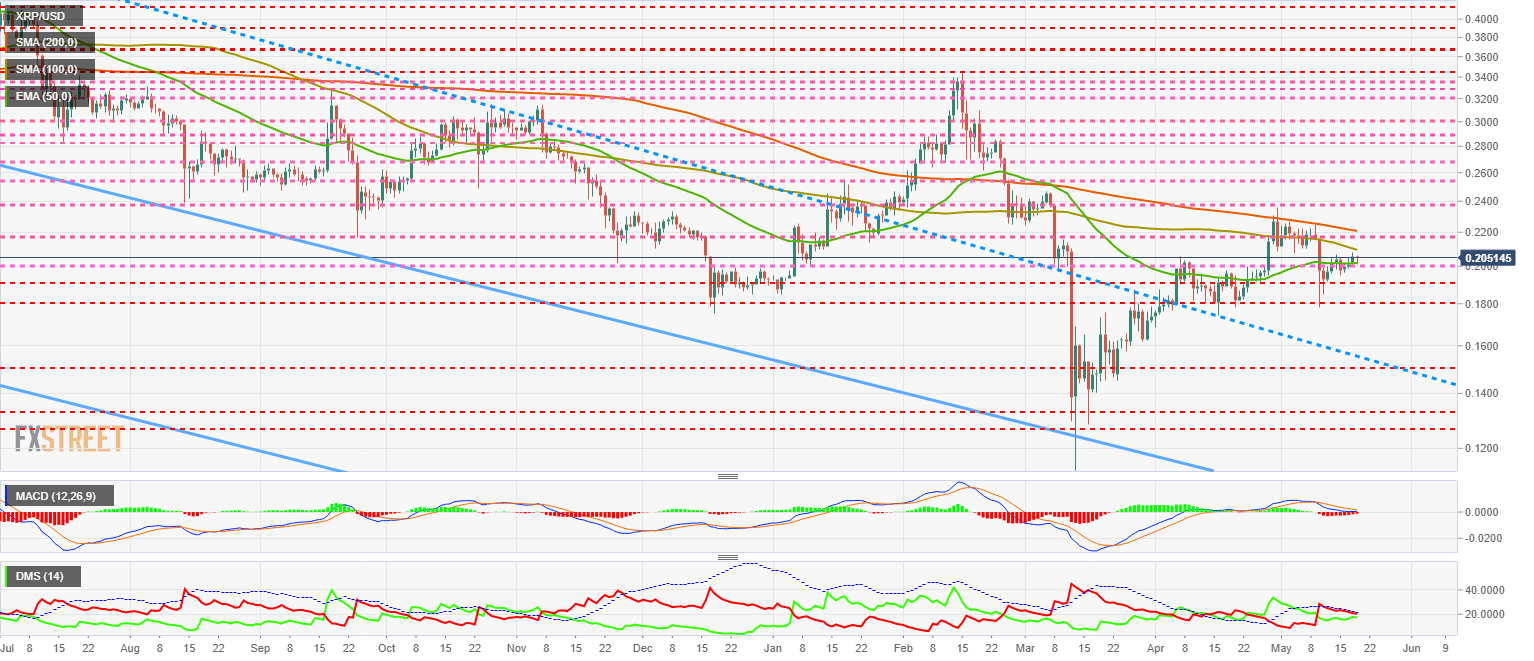 The XRP/USD pair is currently trading at the price level of $0.205 while remaining in a narrow price range for another day. The 100-day and 200-day simple moving averages extend to the $0.223 price level. The critical support level is at the $0.20 level and below it a large gap that could quickly bring the price below the $0.16 level.