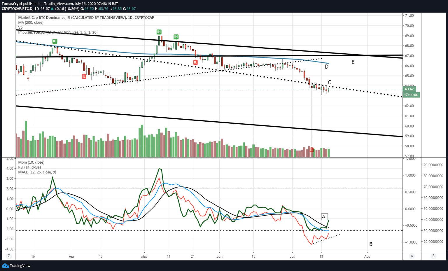 After the daily analysis of the dominance charts and the ETH/BTC pair, today I am presenting the scenario that, in my opinion, has the best chance of materializing.