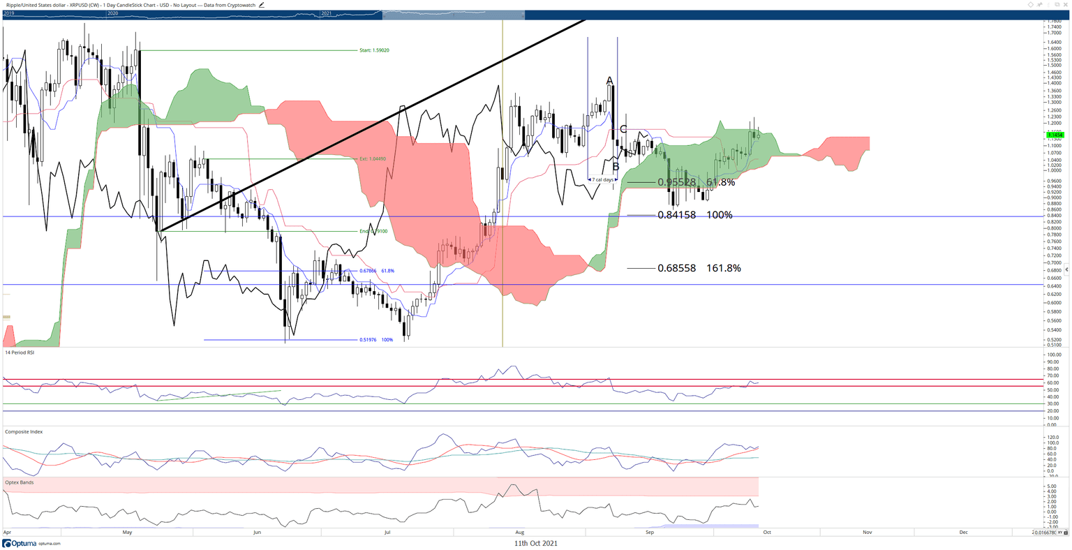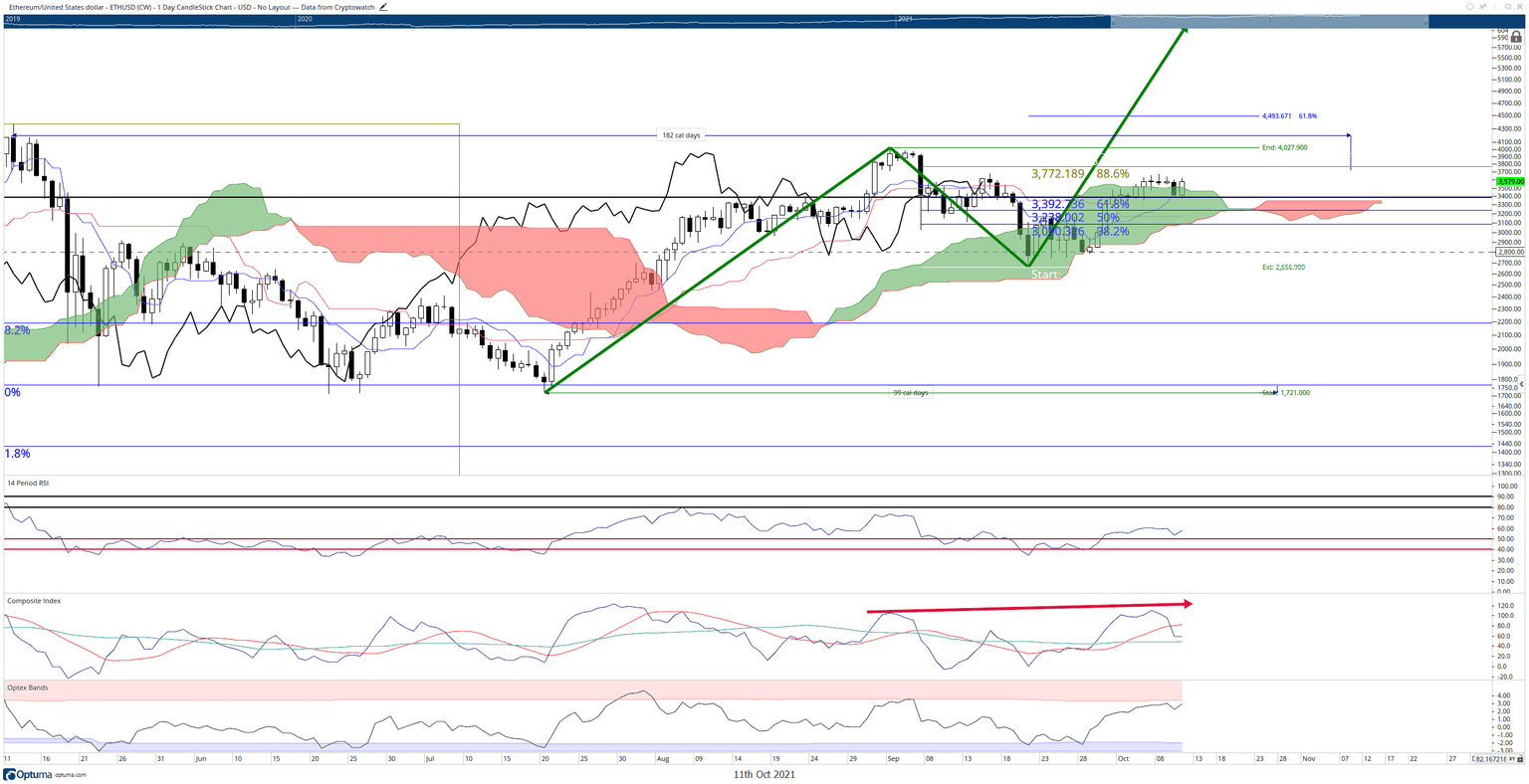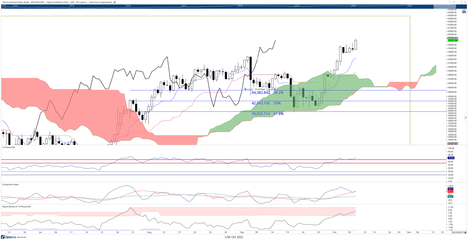 There may be a pause in the really around October 20th when the next Kumo Twist rears its ugly head. If Bitcoin continues to push higher with the same momentum near the October 20th date, then Bitcoin price could experience a swift corrective move and a return to the Tenkan-Sen or Kijun-Sen – roughly a -15% to -33% drop. But that pullback will likely be a regular and fast corrective move. Near-term support is the Tenkan-Sen at $52,000.