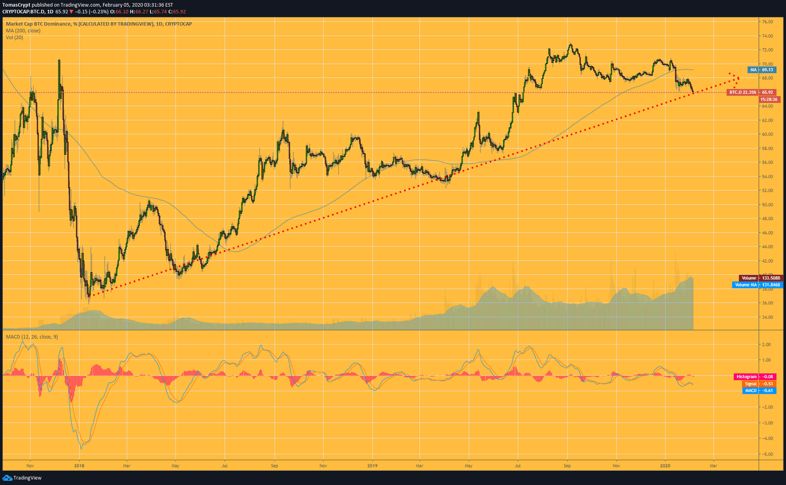 Bitcoin is testing the bullish trend of the chart's dominance over the rest of the market. The guideline has its origin in January 2018, where it started after the strong upward movement at the end of 2017.
