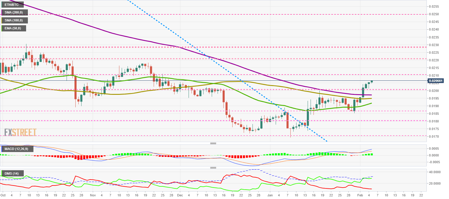 The ETH/BTC pair is currently trading at the price level of 0.02066. This crypto pair has a direct relationship to Bitcoin's dominance over the rest of the market.
