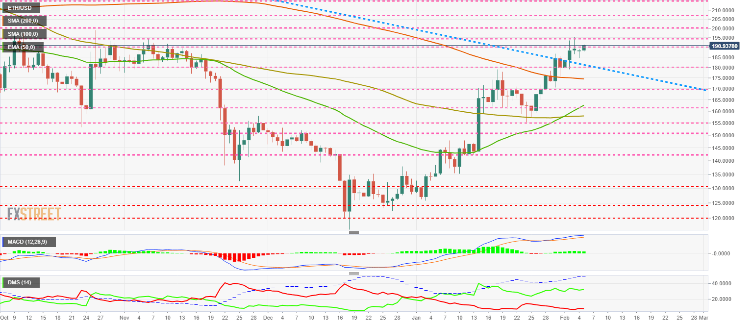 ETH/USD is currently trading at the price level of $190.93 on the fourth day of trying to break the price congestion resistance level at $190.