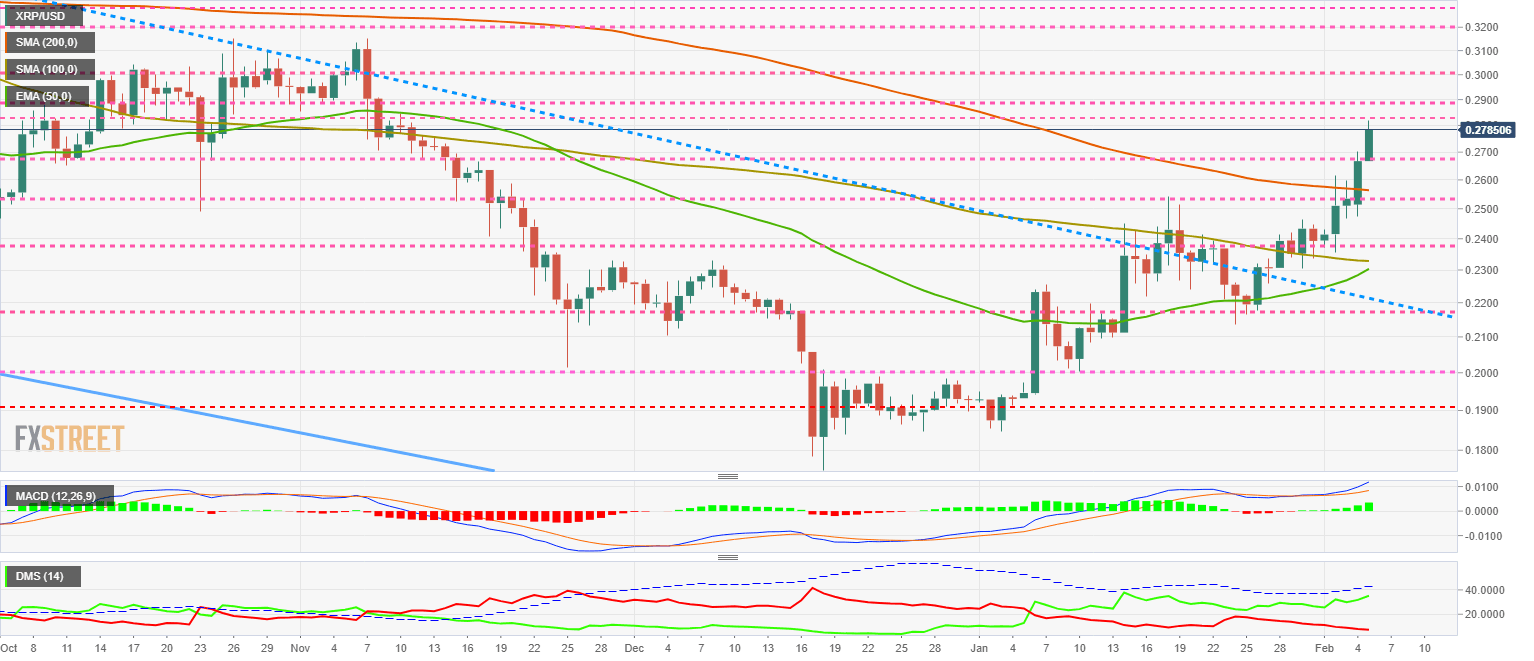 XRP/USD is currently trading at $0.2785 after a first attempt at the $0.28 level. Today's significant rise immediately followed yesterday's move above the SMA200. Ripple’s XRP is approaching a complex zone full of resistance, a barrier that doesn't end until it passes $0.315.