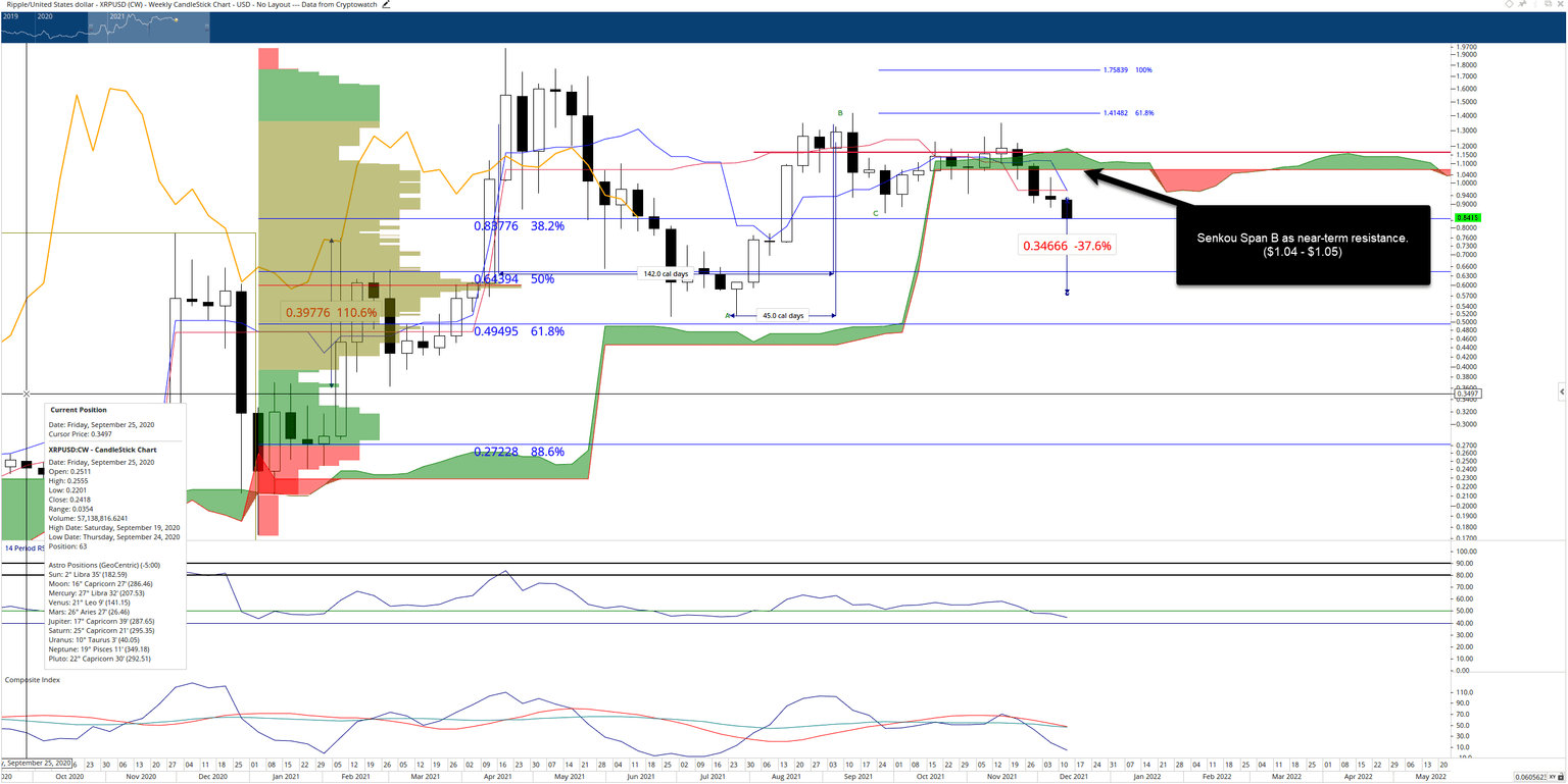 Initial resistance will likely be Senkou Span B at $1.04. Given how long Senkou Span B has traded in a flat condition, if XRP can rally above, it will be a significant, bullish event.