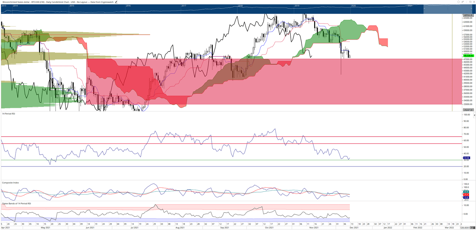 The shaded area on the chart above is the most significant nearby threat for Bitcoin price. There is a significant gap between two high-volume nodes in the 2021 volume profile between $47,000 and $33,000. Bitcoin is just barely holding onto that final support zone.