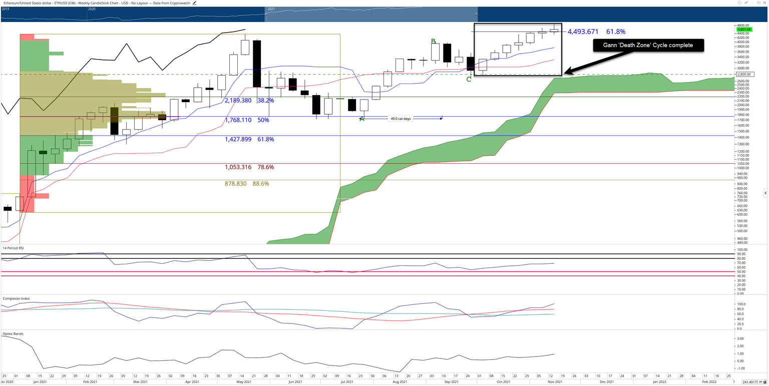 Ethereum price, despite making new all-time highs, is under threat of making a deep corrective move due to a powerful Gann time cycle that Gann referred to as his ‘Death Zone’ cycle. This cycle is a forty-nine to fifty-two-day cycle (seven weeks). Gann wrote that a violent corrective move is likely if an instrument is trending at a steep slope over seven weeks. Ethereum is a textbook example of this cycle. Given the significant gaps on the weekly chart between the candlestick bodies and the Tenkan-Sen, a corrective move is increasingly likely.