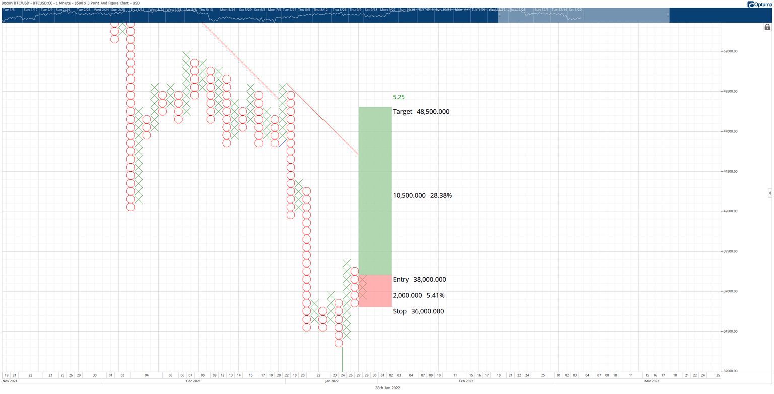 On the long side of the trade, the theoretical long setup is a buy stop order at $38,000, a stop loss at $36,000, and a profit target at $48,500. The trade represents a 5.25:1 reward/risk setup. A two to three-box trailing stop would help protect any implied profit post entry. While the Vertical Profit Target Method identifies $48,500 as the max potential, it is more probable that Bitcoin price will be halted somewhere just below the bear market trendline – somewhere between $43,000 and $45,000.