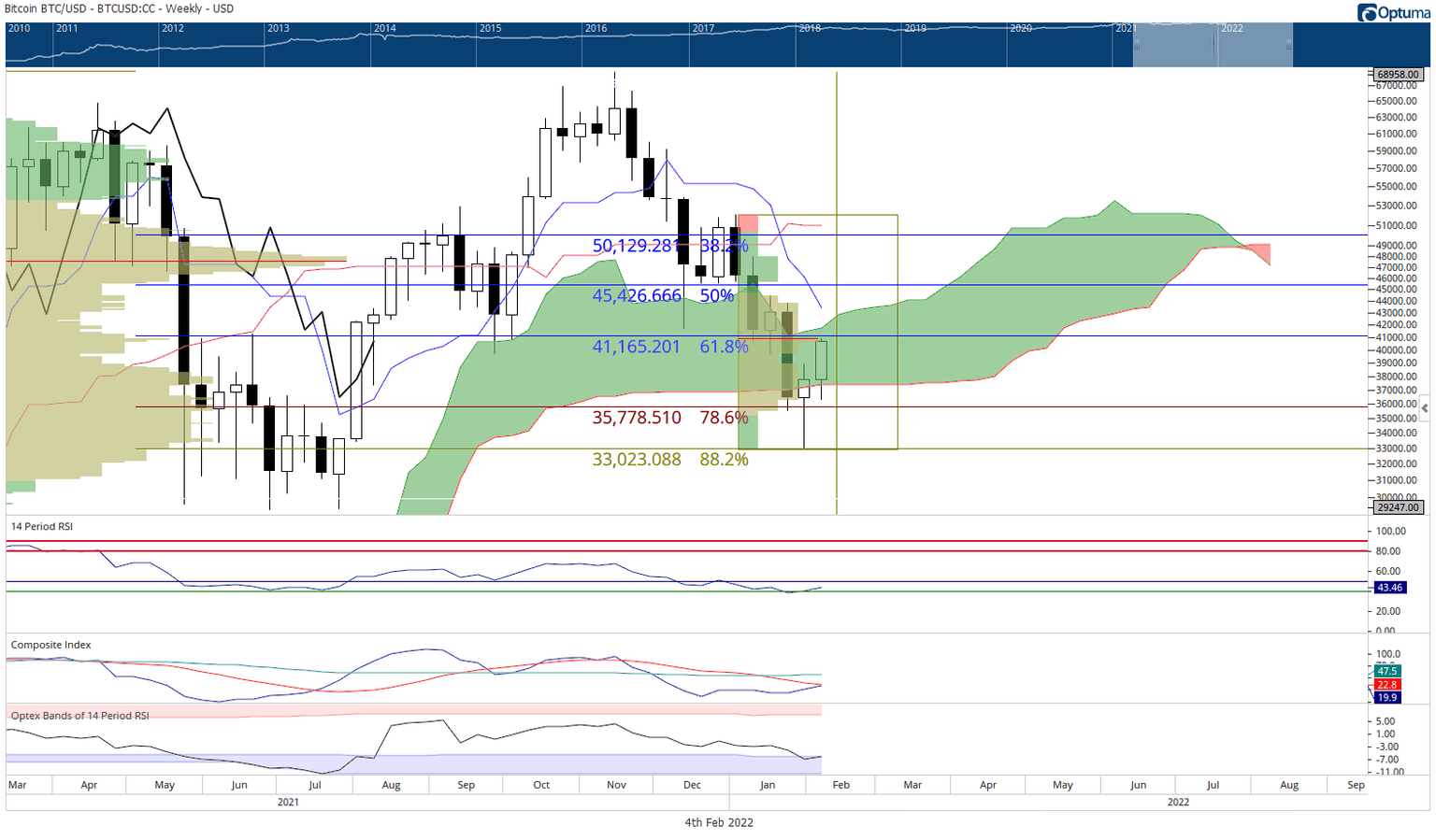 Upside potential going into the weekend is likely limited to the $41,000 to $42,000 value area. The 61.8% Fibonacci retracement, top of the weekly Ichimoku Cloud, 2022 Volume Point Of Control, and weekly Tenkan-Sen sit above Bitcoin between the price ranges of $41,200 and $43,250.