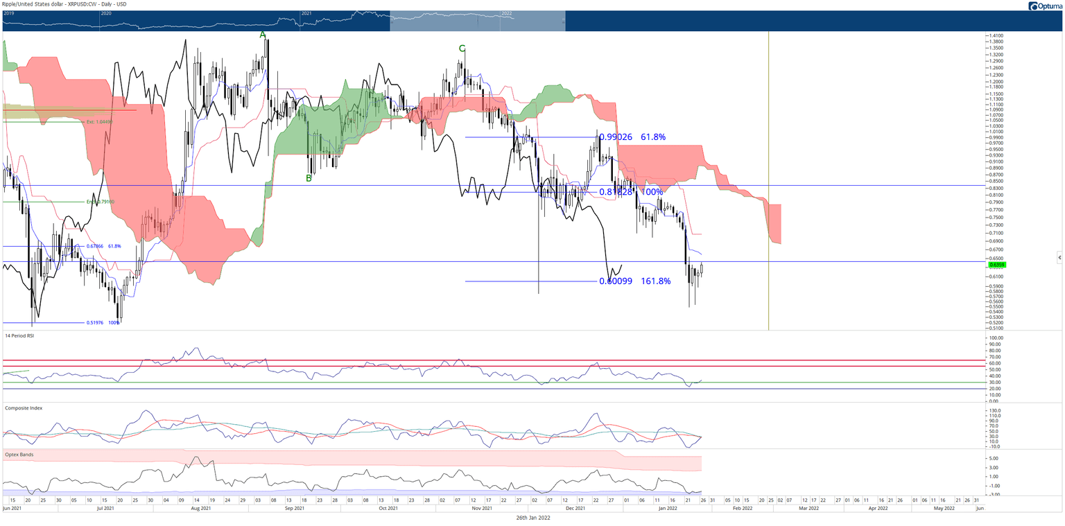 XRP price action has found a strong support level near the 50% Fibonacci retracement at $0.64 and the 161.8% Fibonacci retracement at $0.60. This support comes in as XRP has developed highly oversold conditions in the Relative Strength Index, Composite Index, and Optex Bands oscillators.