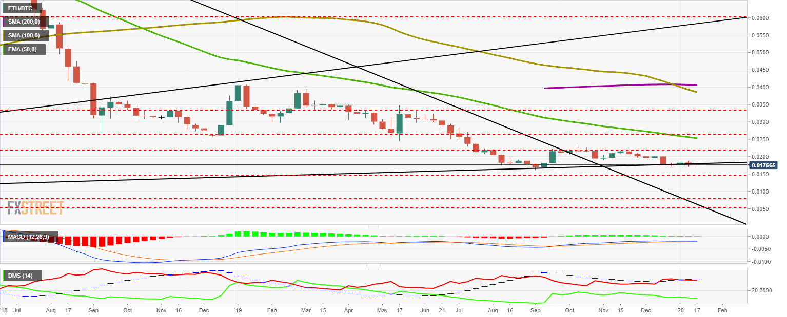 The price finds support in the trend line that starts in December 2017, just before the bullish explosion. The risk of a breakout is very high, and ETH/BTC needs to change direction completely to avoid disaster.