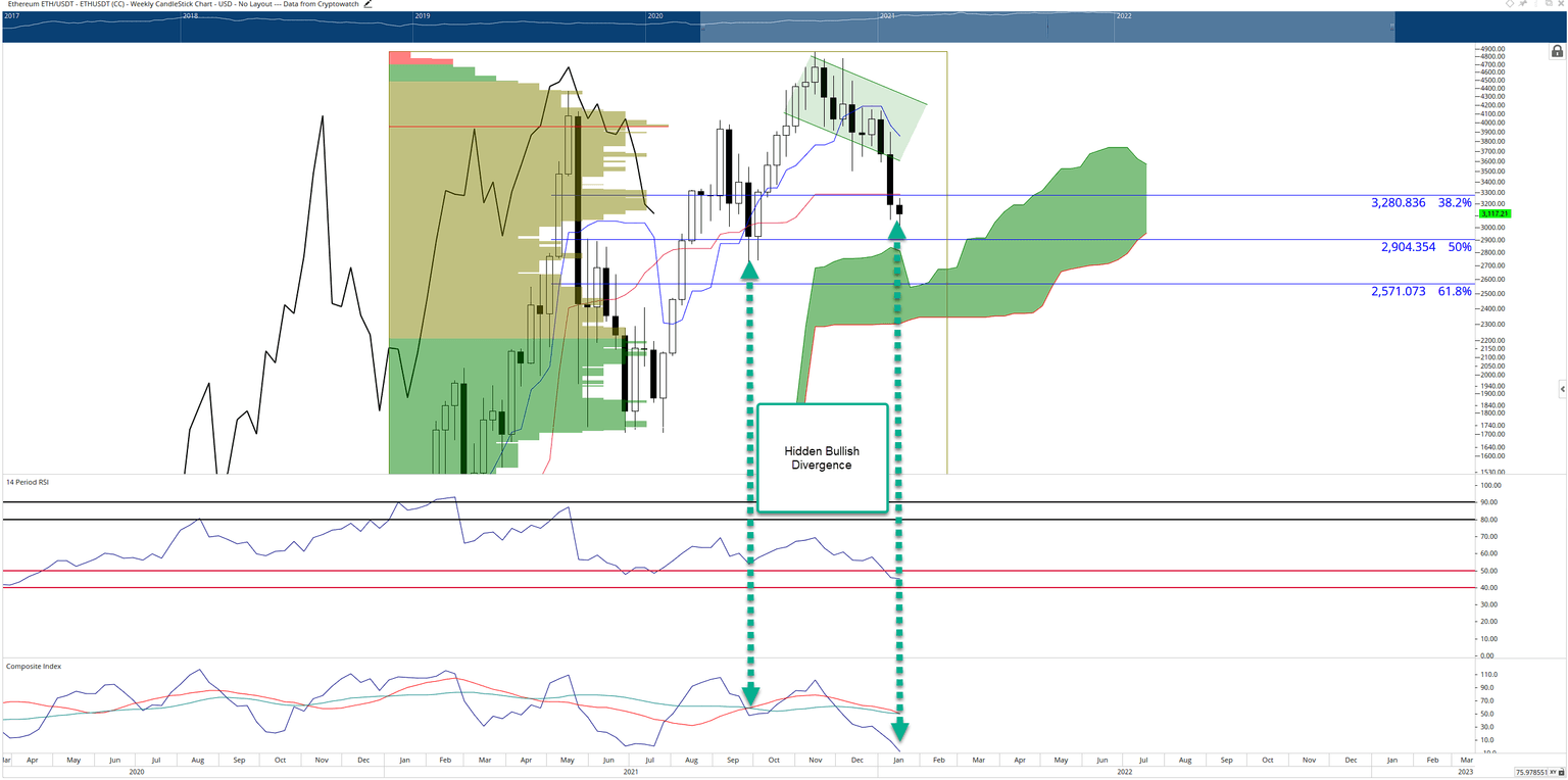 Ethereum price is likely poised for a swift and incredible bullish reversal very, very soon. The reasons for this imminent reversal are based on the support found against the 50% Fibonacci retracement on the weekly Ichimoku chart and the hidden bullish divergence between the candlesticks and the Composite Index - the Composite Index is at lows not seen since September 2019.