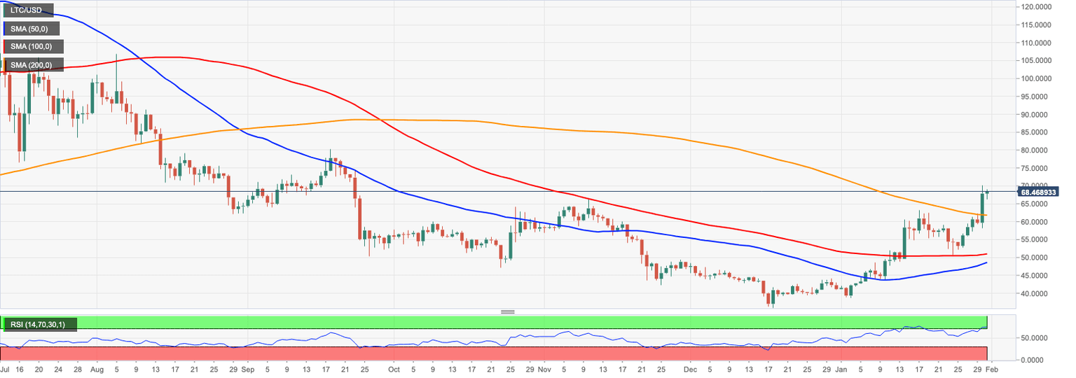 This support is an important milestone in Litecoin's price momentum that can serve a catalyst for another bull's rally. However, traders should exercise caution at this levels as the rejection from $70.00 may trigger downside correction, before another upside wave starts. The RSI on a daily chart is on the overbought territory, which also implies a retreat from the recent highs.