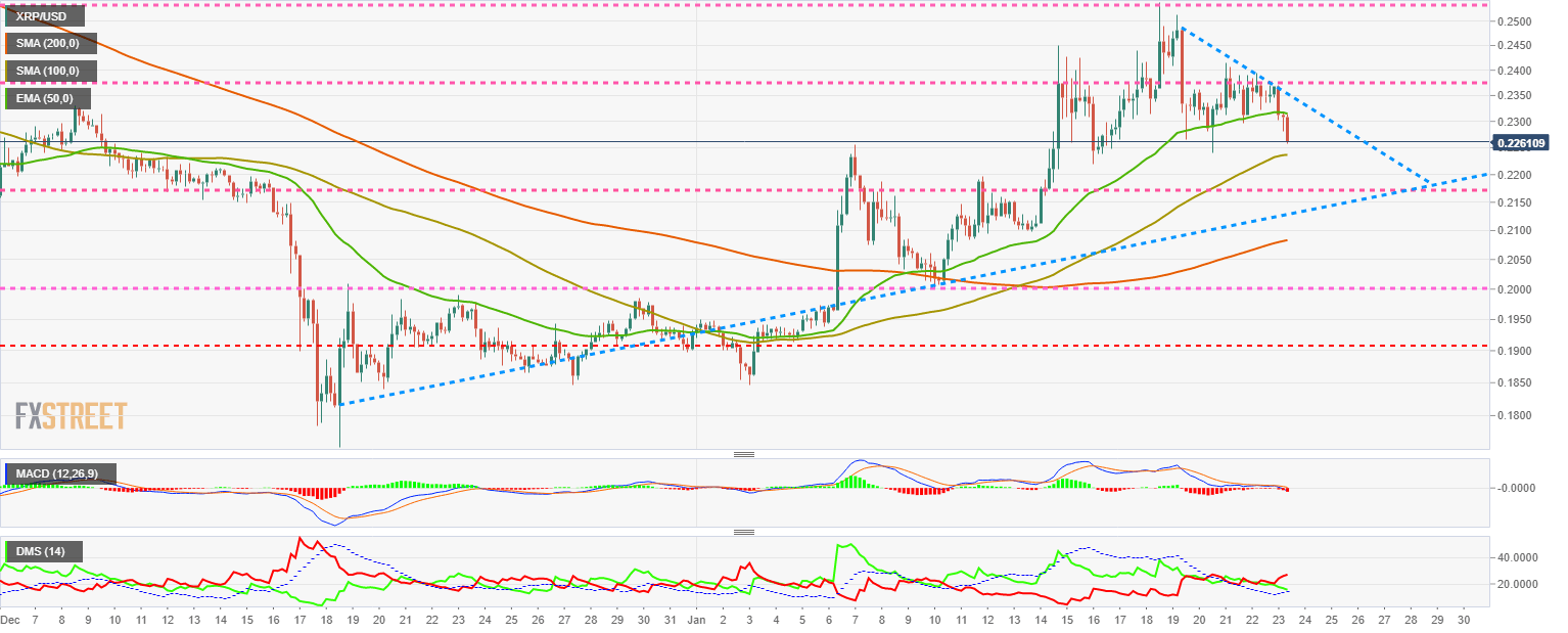 XRP/USD is currently trading at $0.2261 and has lost all support from the EMA50 on the 4-hour chart. The exponential moving average is curving downward, and the SMA100 is losing its upward slope, which could signal a wide range of downward movement.