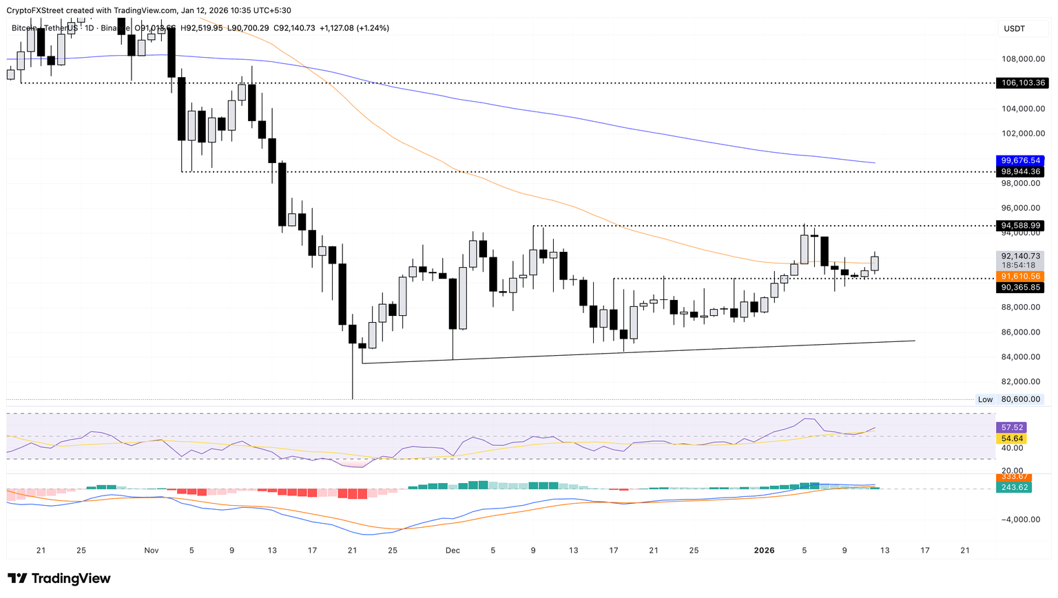 Bitcoin edges higher by 1% at press time on Monday, extending Sunday’s rebound from near the December 17 high of $90,365. The intraday recovery trades above the 50-day Exponential Moving Average (EMA) at $91,610, aiming for the December 9 high at $94,588.