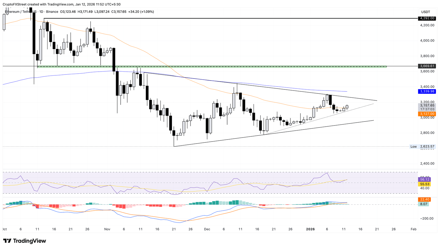 Ethereum trades above $3,100 at the time of writing on Monday, holding above the local support trendline connecting the December 18 and 29 lows.