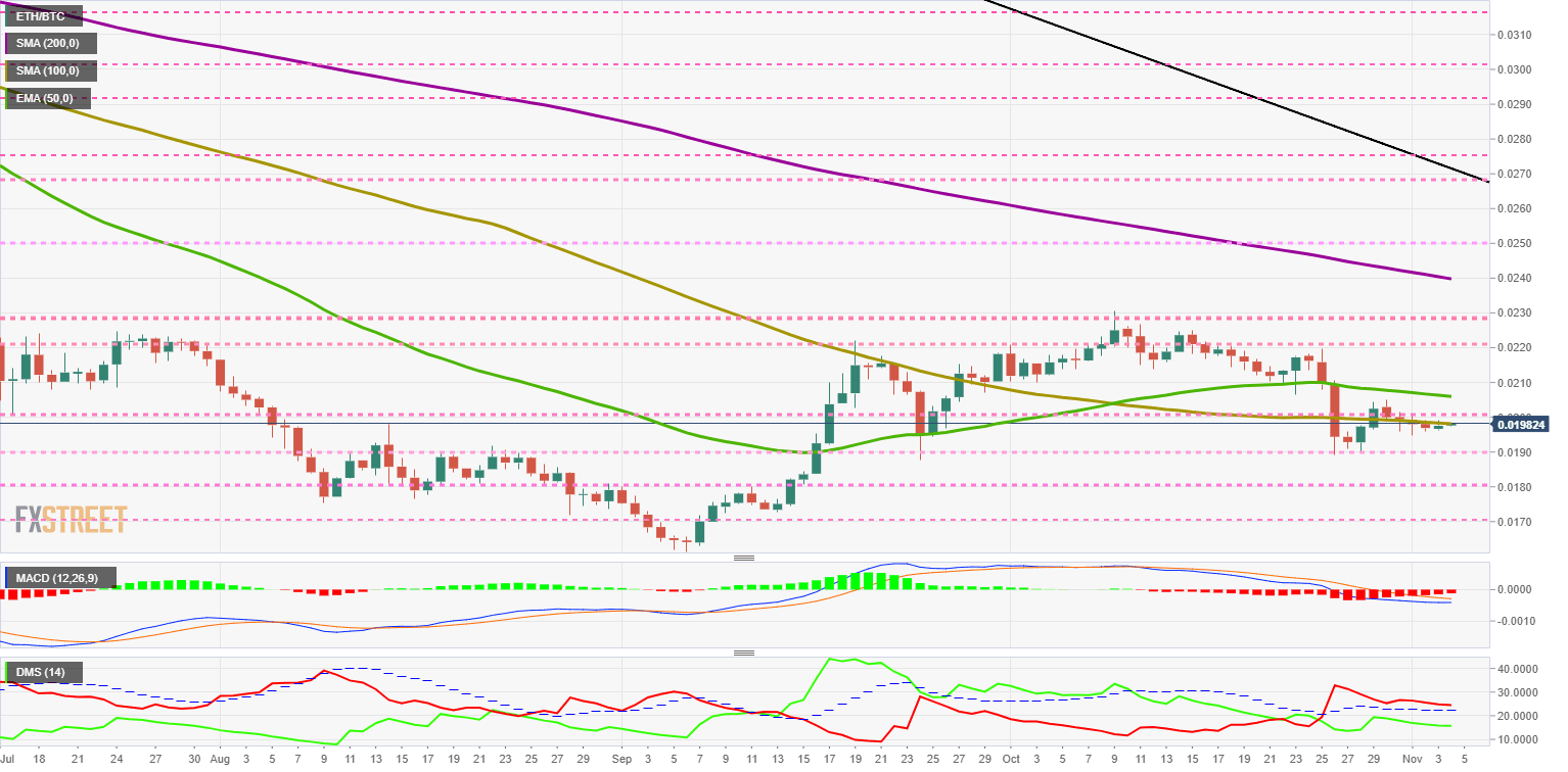 The ETH/BTC cross is currently trading at the price level of 0.0198 and is mimicking the extreme lack of volatility seen in the Top 10 cryptos by capitalization.