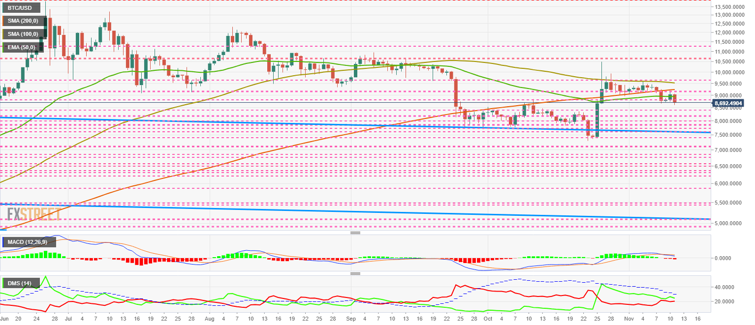 The BTC/USD pair is currently trading at the $8.692 price level and is marking a new relative low in the short term. The current scenario remains active above the $7,500 price level as support, and at $9,650 as resistance.