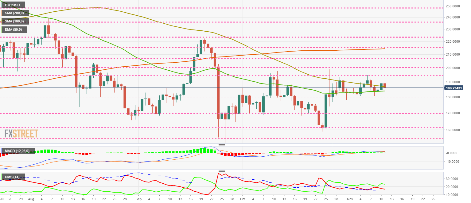 The DMI on the daily chart shows the bulls dominating the ETH/USD pair, although the bears keep the chances of fighting for leadership alive.