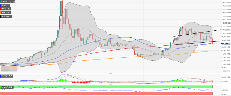 At the time of writing, BTC/USD is moving fast towards $7,000. This psychological barrier may hold the bears back for the time being. Though once it is out of the way, the bottom will fall out and the price may collapse to as low as $5,000. This barrier is created by SMA200 (Simple Moving Average) weekly. On the upside, we will need to see a recovery above at least $7,550 (the neckline of the above-mentioned head-and-shoulder pattern coupled with SMA100 weekly.