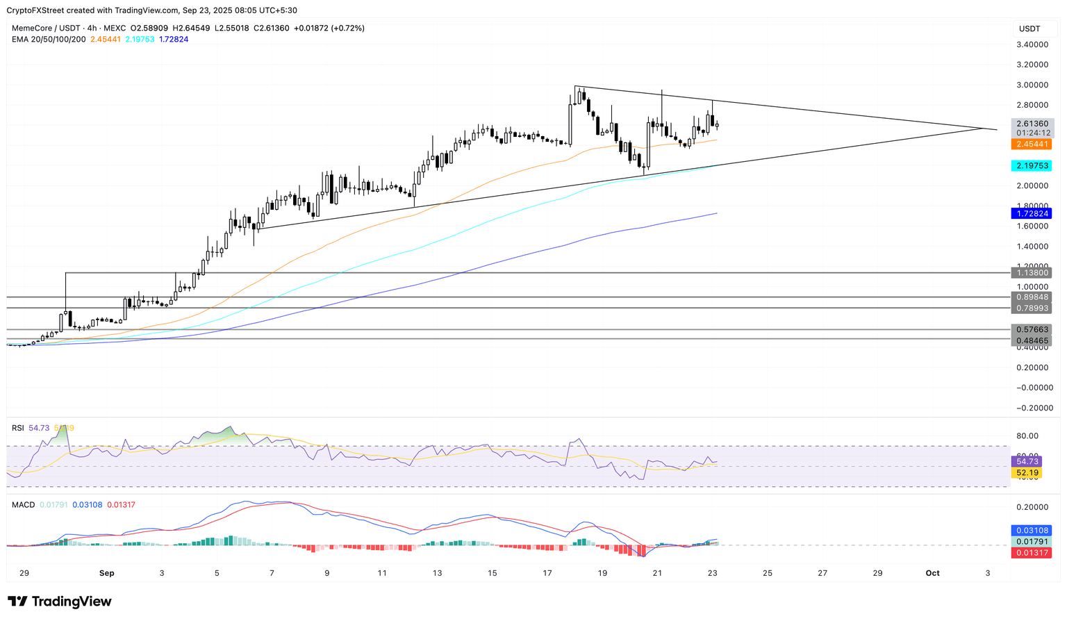 MemeCore trades above $2.60 at press time on Tuesday, sustaining the 8.42% gains from Monday. The meme coin reverses within a symmetrical triangle pattern on the 4-hour chart, targeting the 50-period EMA at $2.45.