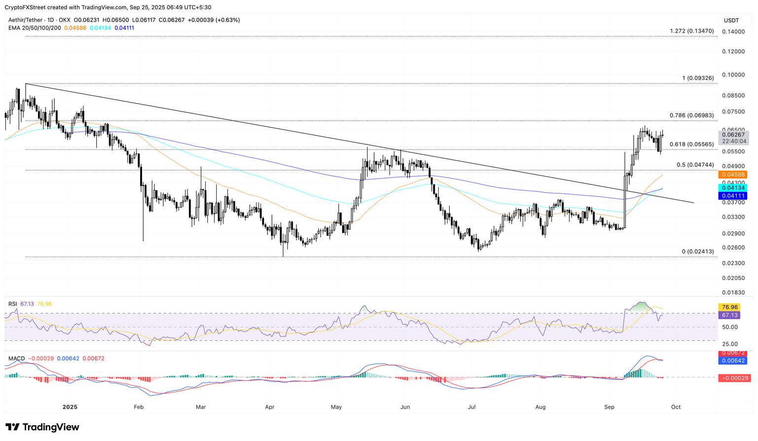 The ATH rally targets the 78.6% Fibonacci retracement level at $0.06983 as bullish momentum builds.