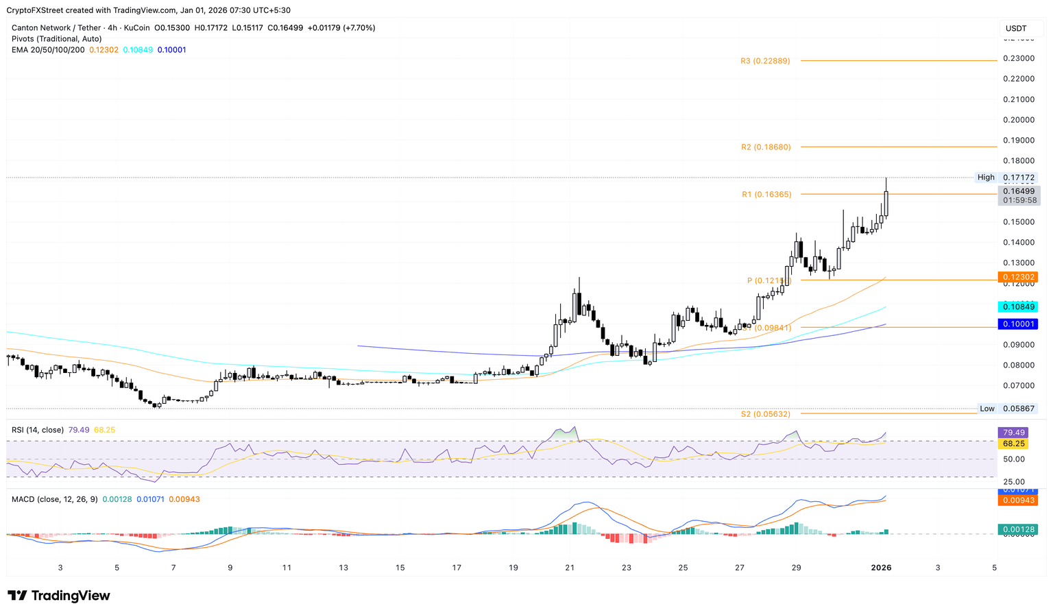 Canton is up nearly 8% at press time on Thursday, adding gains to the 3% rise from the previous day. The intraday recovery holds above the R1 Pivot Point at $0.1636 on the 4-hour chart, with bulls waiting for a decisive close.
