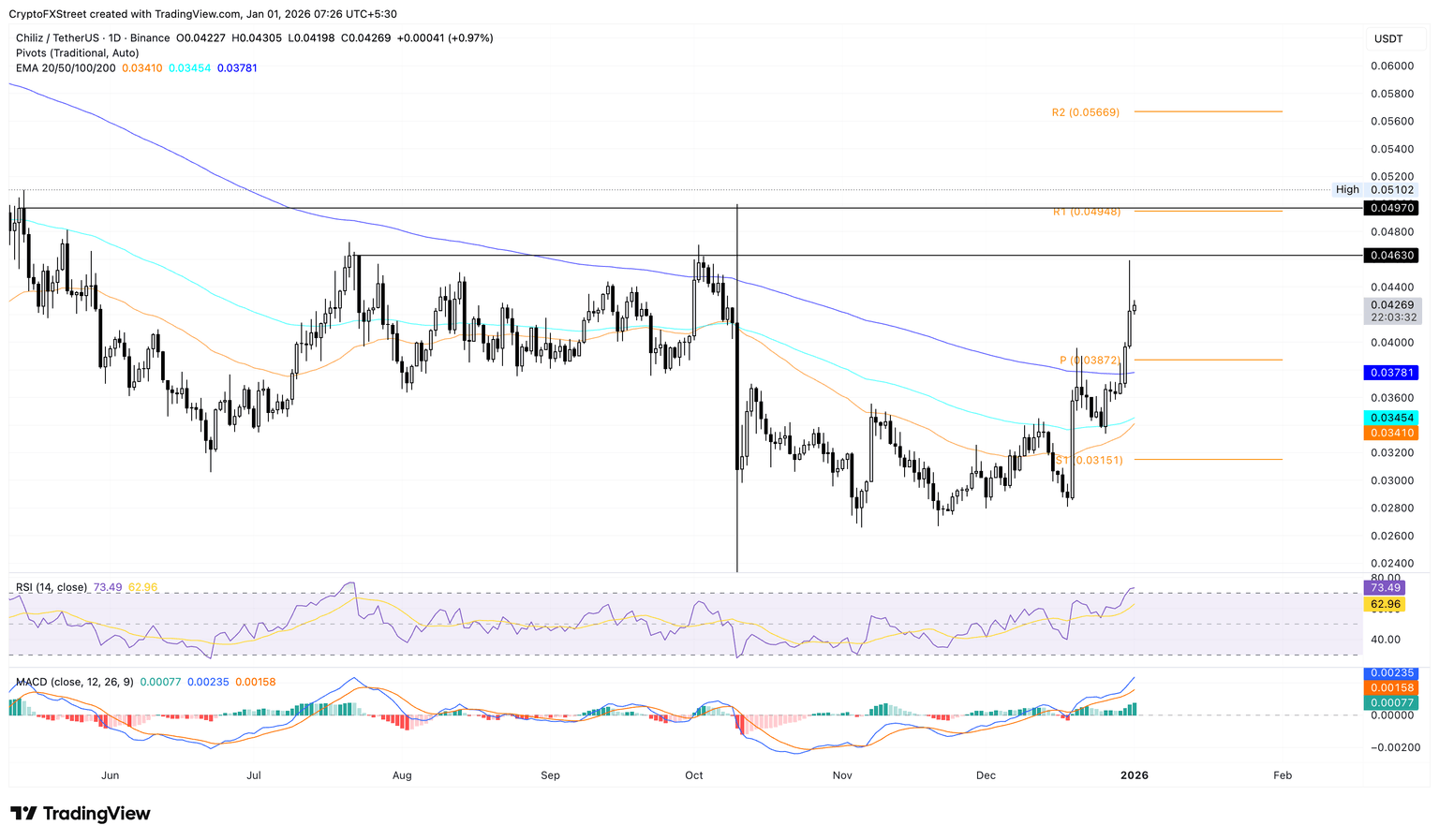 Chiliz trades above $0.04000 at press time on Thursday, extending the 6.50% rise from the previous day. The intraday recovery marks the fourth day of the uptrend, accounting for over 17% weekly gains so far.