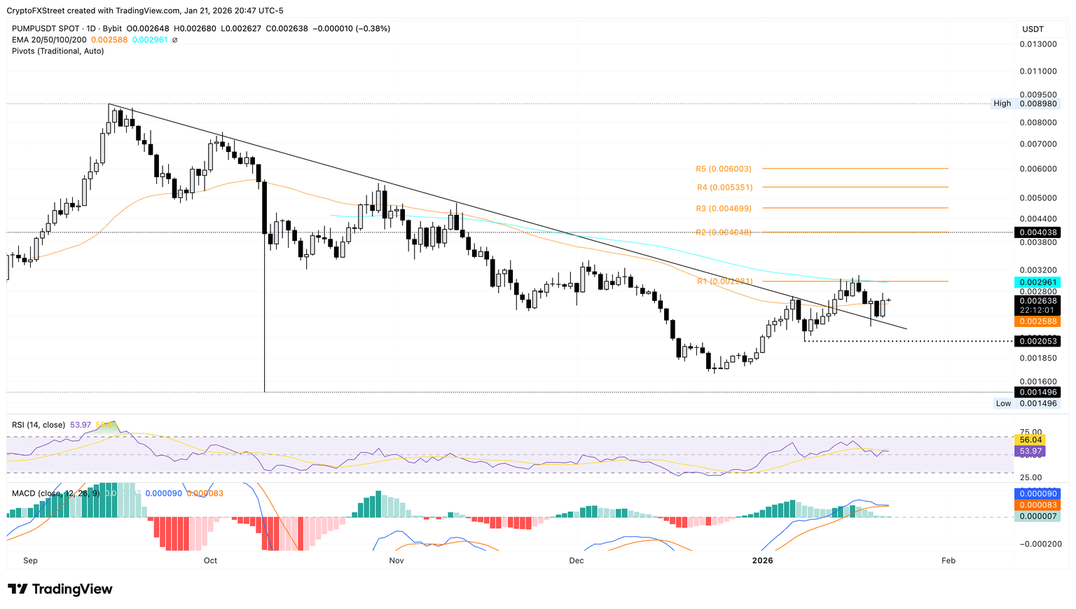Pump.fun trades above the 50-day EMA at $0.0025 at press time on Thursday, following a 10% rebound on Wednesday. The Solana-based launchpad token targets the 100-day EMA and the R1 Pivot Point, coinciding near $0.0029 if the recovery run gains traction.