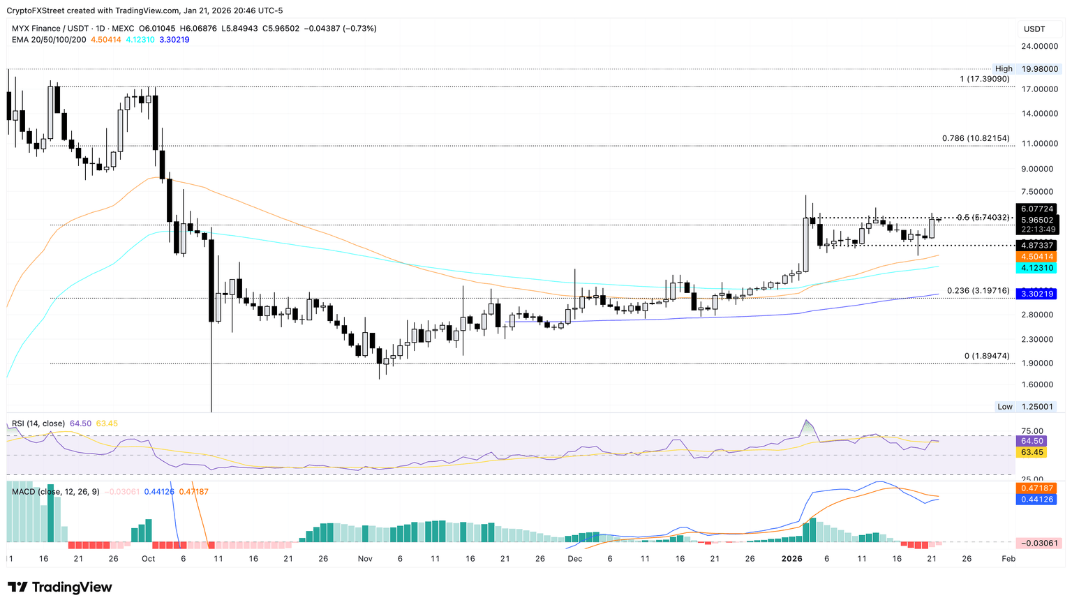 MYX Finance is extending its sideways trend within a consolidation range between $4.87 and $6.07 on the daily chart. At the time of writing, MYX trades above $6, teasing a breakout of the $6.07 ceiling.