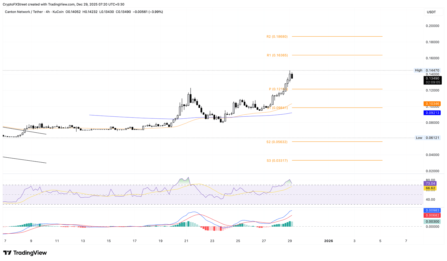 Canton is down 4% at press time on Monday, starting the week on a bearish note after a 23% jump on Sunday. The pullback after three days of uptrend risks a retest of the centre Pivot Point at $0.1215 on the 4-hour chart, followed by the $0.1000 psychological mark.