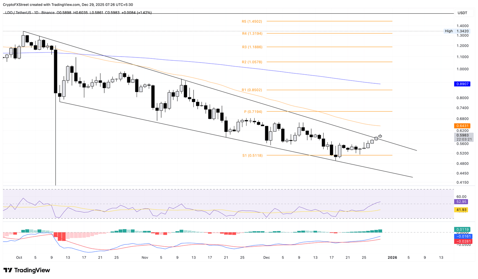 If LDO slips below Sunday’s low at $0.5743, it could nullify the wedge pattern breakout, risking a potential drop to the S1 Pivot Point at $0.5118.