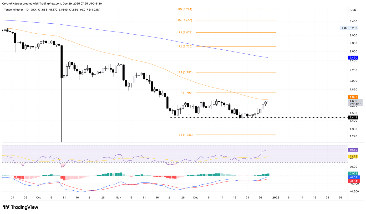 If TON reverses from $1.69, it could retest the $1.444 support level, which has remained intact since November 21.