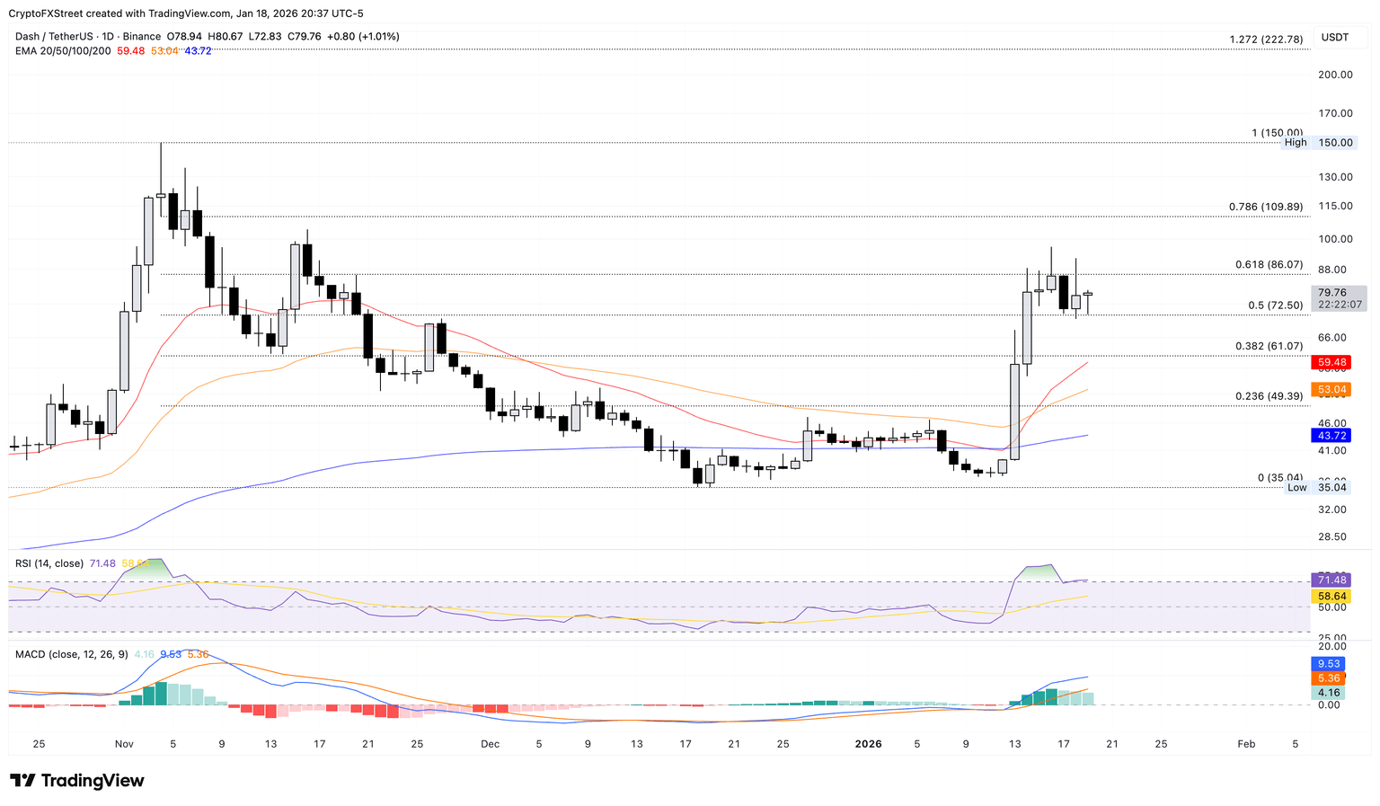 Dash trades around $80 at press time on Monday, climbing from $72 earlier on the low. The privacy coin is trading roughly within the 50% and 61.8% Fibonacci retracement levels at $72 and $86, respectively, measured from the November 4 high to the December 19 low.