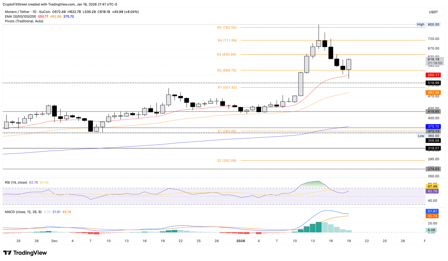 Monero exceeds $600, bouncing off the R2 Pivot Point at $569 to avoid a drop below the 20-day Exponential Moving Average (EMA) at $548. At the time of writing, XMR is up 5% on Monday, recovering after a four-day decline of 20% from roughly $700, as previously forecasted by FXStreet.