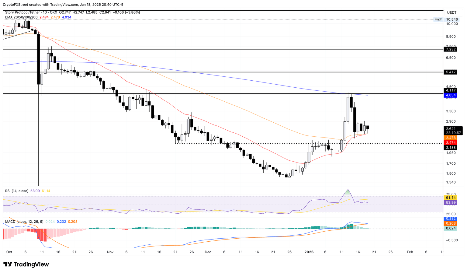 Story is down roughly 4% at press time on Monday, starting the week on a bearish note after Sunday’s 7% rise. The meme coin consolidates above $2.50, while the rising 20-day EMA converges with the 50-day EMA at $2.47, setting up a potential crossover. Such a crossover would indicate a renewed strength in the short-term recovery.