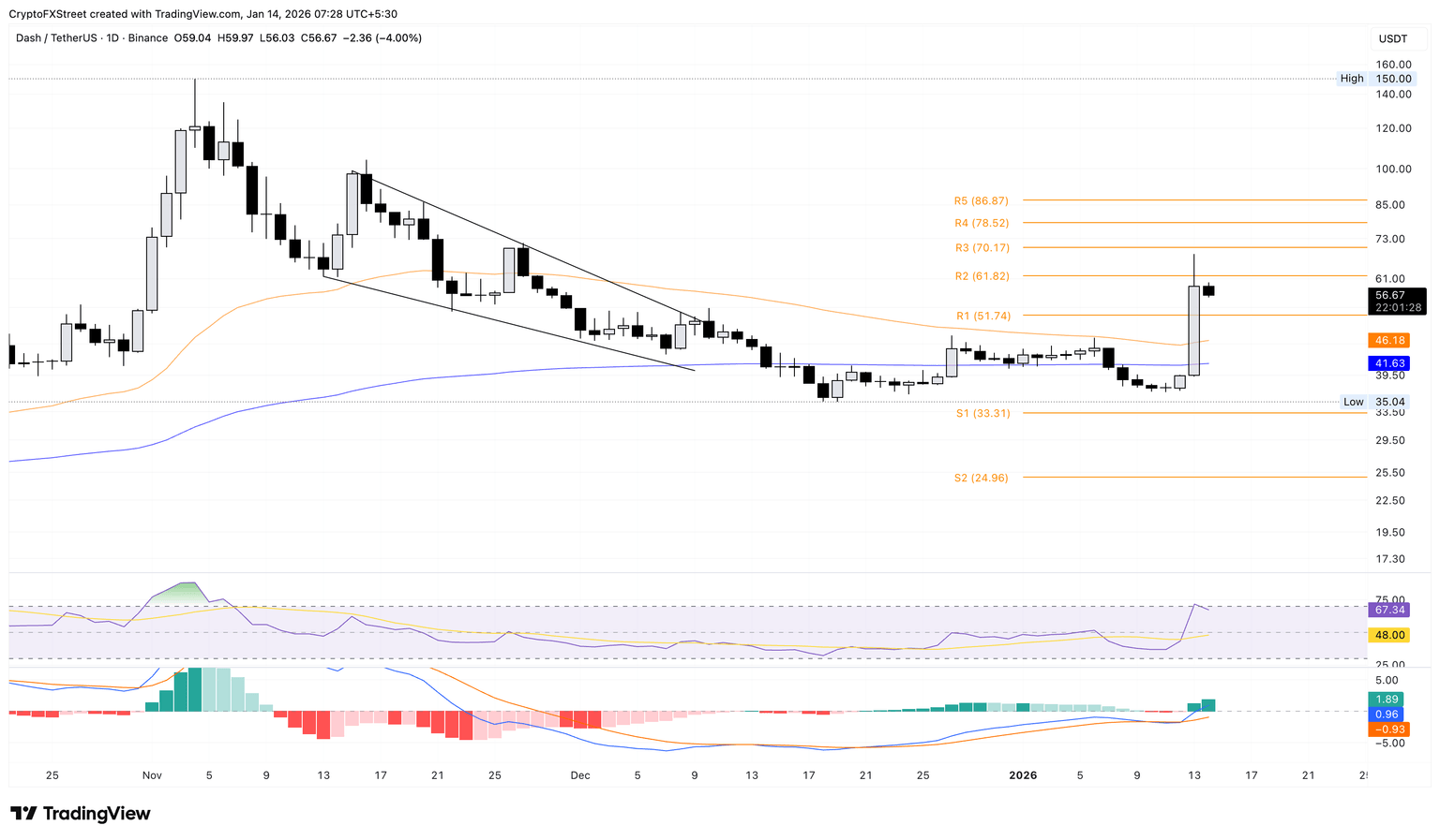 If DASH clears this level, it could aim for the R3 Pivot Point at $70.