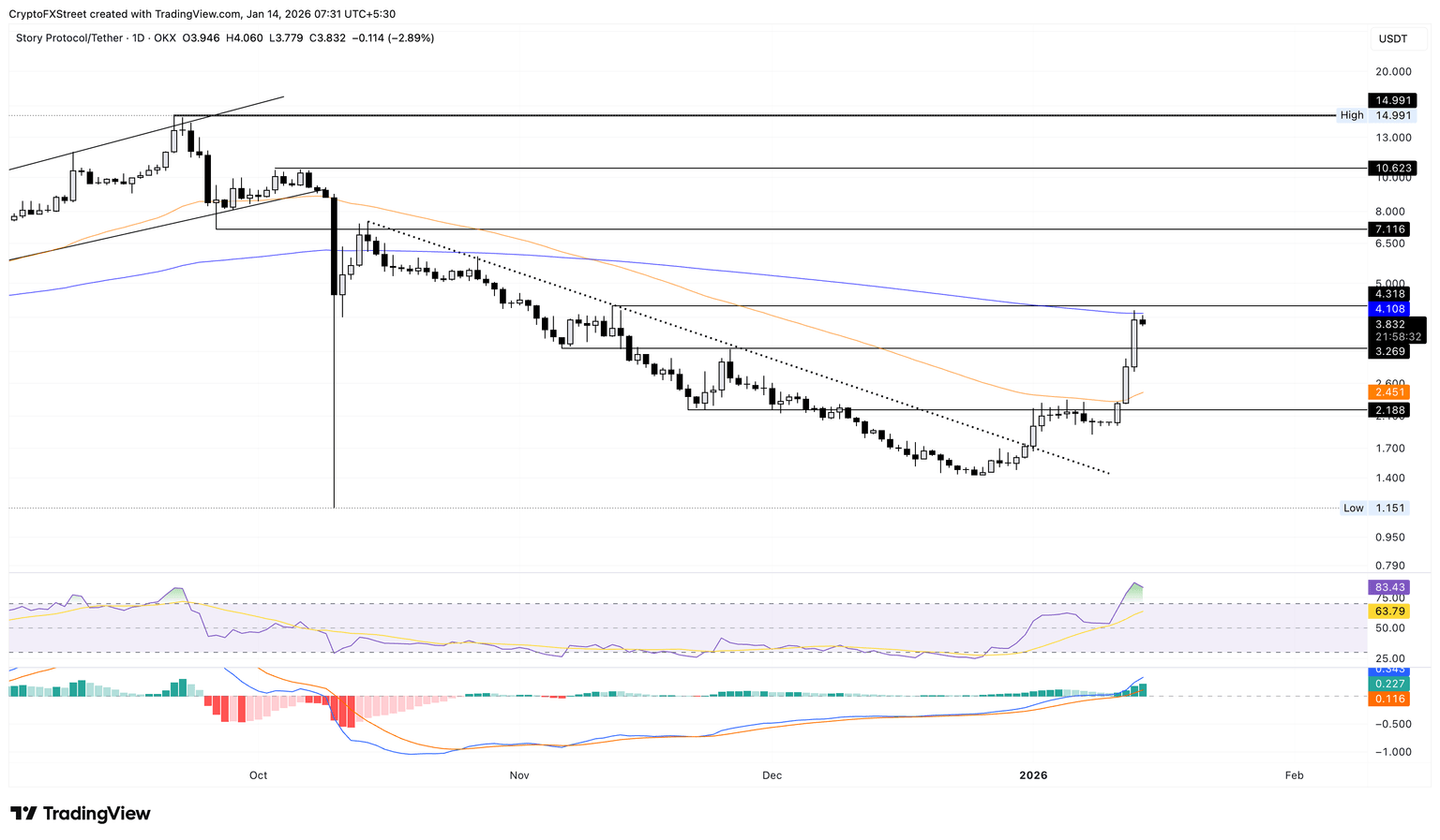Story is down 3% at the time of writing on Wednesday, cooling off from the 36% rally on Tuesday. The meme coin faces headwinds at the 200-day Exponential Moving Average (EMA) at $4.10, capping the gains above the $4.00 round figure.