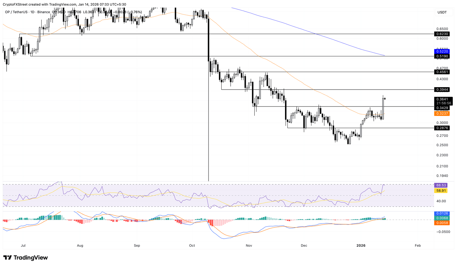 If OP clears this round figure, it could rise toward the $0.4561 level, which capped a rebound in mid-November.