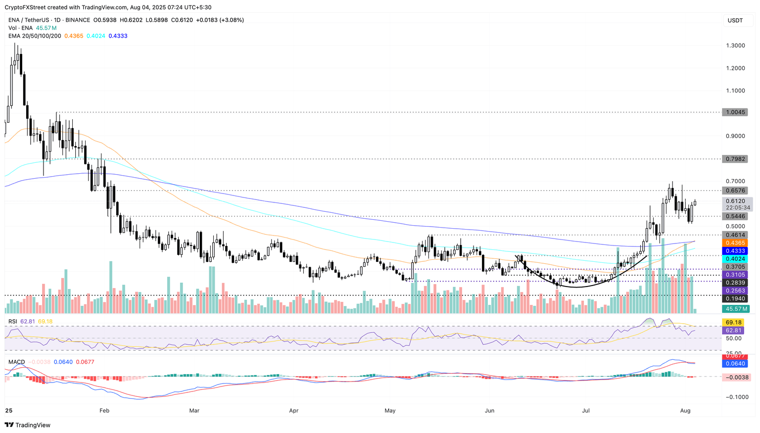 ENA/USDT daily price chart.